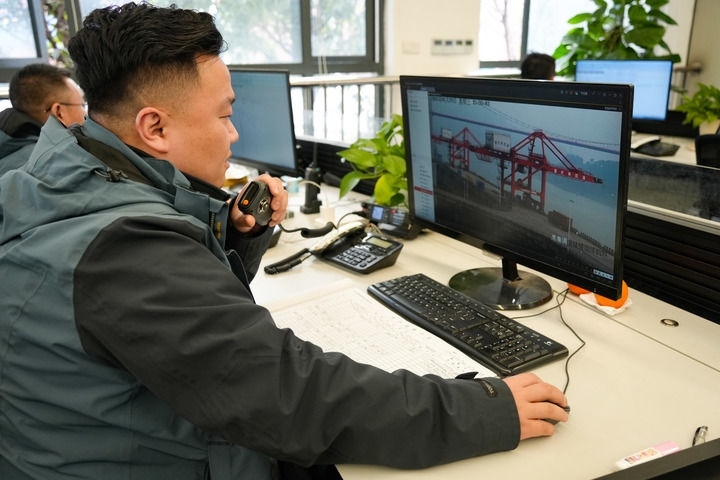 1月29日,調(diào)度員耿杰在重慶果園港集裝箱公司生產(chǎn)調(diào)度指揮中心內(nèi)值班。新華社記者 田金文 攝