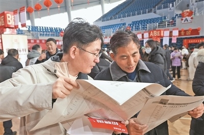 2月3日,求職者在江蘇省揚(yáng)州市寶應(yīng)縣新春大型人力資源招聘洽談會上尋找就業(yè)崗位。