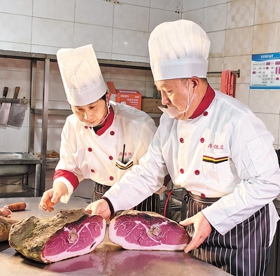 宣威市存香飯店,大廚徐天勇正忙著挑選食材,而烏金豬是制作宣威火腿的最佳原料?!半缰七^(guò)程也很重要,鹽的比例要恰到好處,多一分則咸,少一分則不夠味,經(jīng)過(guò)兩三年發(fā)酵,火腿就可以達(dá)到生吃的標(biāo)準(zhǔn)了?!毙焯煊掠霉轻樰p輕插入火腿的上、中、下部,火腿肉質(zhì)清香撲鼻,“就是它了。”