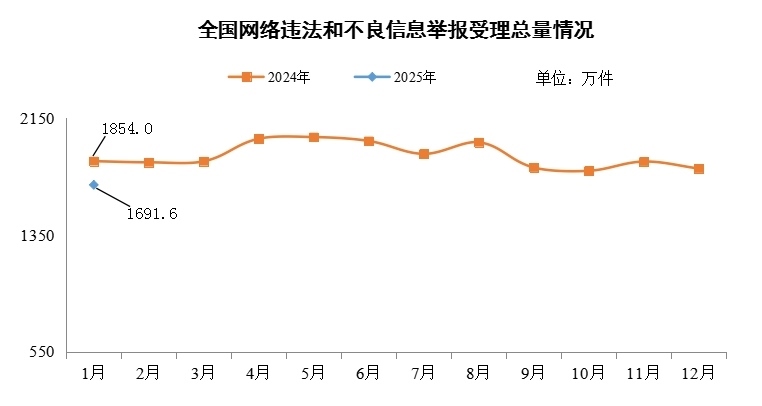 中央網信辦舉報中心2月17日公布的數據顯示,2025年1月,中央網信辦舉報中心指導全國各級網信舉報工作部門、主要網站平臺受理網民舉報色情、賭博、侵權、謠言等違法和不良信息1691.6萬件,環(huán)比下降6.2%、同比下降8.8%。