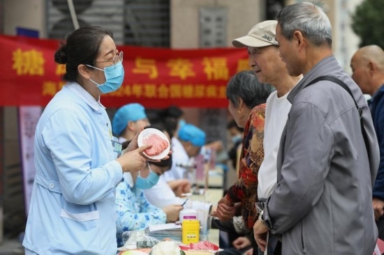 2024年11月14日在浙江省嘉興市南湖區(qū)南湖街道文星社區(qū),海警醫(yī)院護士為居民進行健康飲食指導(dǎo)。新華社發(fā)(金鵬攝)