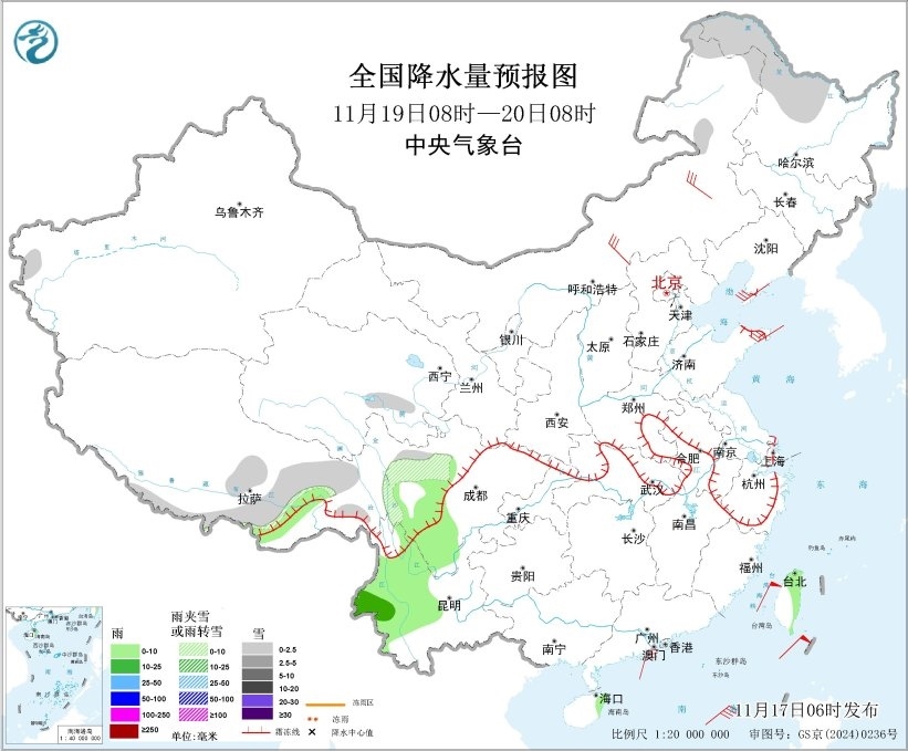 11月17日08時至18日08時,內蒙古東北部、黑龍江東部、吉林東部、河南西南部、陜西東南部、湖北西北部等地部分地區(qū)有小到中雪或雨夾雪,其中,陜西東南部、湖北西北部等地局地有大雪(5~9毫米);江淮西部、江漢、江南北部和西部、西南地區(qū)東部和南部、華南北部和西部等地部分地區(qū)有小到中雨。新疆北部、甘肅北部、青海東部和南部、內蒙古中東部、黑龍江東部、華北北部、遼東半島、山東半島、江漢東部、湖南北部、江西北部、浙閩東部沿海等地的部分地區(qū)有5~6級風、陣風7~9級;渤海、渤海海峽有7級風、陣風8級,黃海大部、東海大部、臺灣海峽、臺灣以東洋面、南海北部和中部、北部灣有7~8級風、陣風9~10級,其中,東海南部、臺灣海峽的部分海域風力可達9級、陣風10~11級。