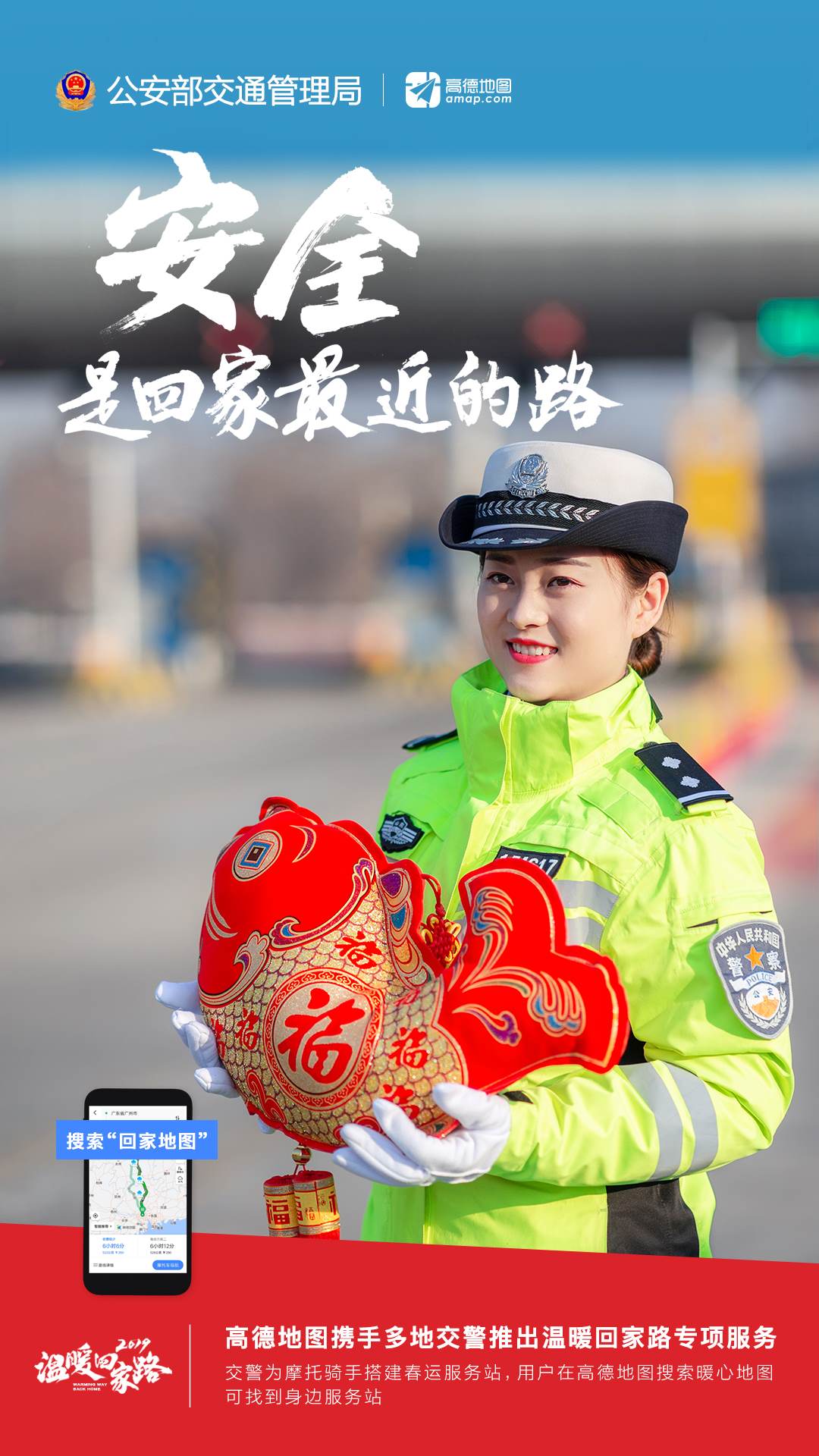 為做好2019年春運保障工作,特別是發(fā)動社會力量做好交通安全社會協(xié)同治理,廣東、廣西、福建、江西、湖北、云南、安徽、四川、湖南等春運重點省、自治區(qū)交警總隊聯(lián)合高德地圖啟動2019年春運“溫暖回家路”專項,推出“回家地圖”系列在線服務(wù),通過“交警+科技”結(jié)合,助力人民群眾安全返鄉(xiāng)。同時,與人民日報社、新華社、中央廣播電視總臺等媒體,以及中廣聯(lián)合會、中國交通頻道等機(jī)構(gòu)和微博、秒拍、一直播等新媒體平臺聯(lián)動,共同開展2019年春運交通安全宣傳工作。