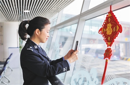 2月6日,青島機場出入境邊防檢查站女子旅檢科民警馮哲利用工作間隙與遠在老家的兒子視頻通話。解豪攝(新華社發(fā))