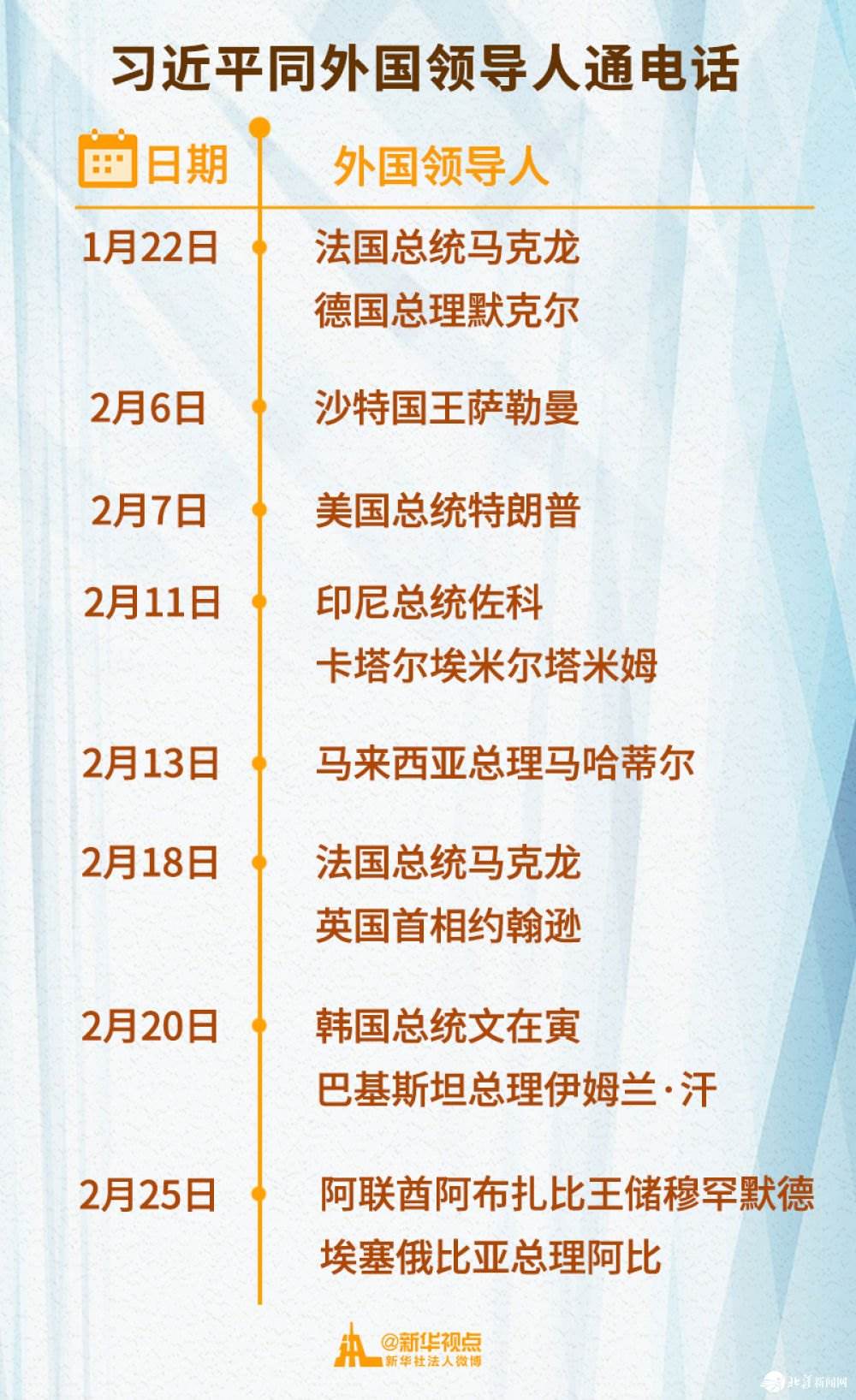 2月以來,習(xí)近平主席已先后同11位外國(guó)領(lǐng)導(dǎo)人通電話,涉及國(guó)家遍及亞洲、歐洲、非洲、美洲等地區(qū)。