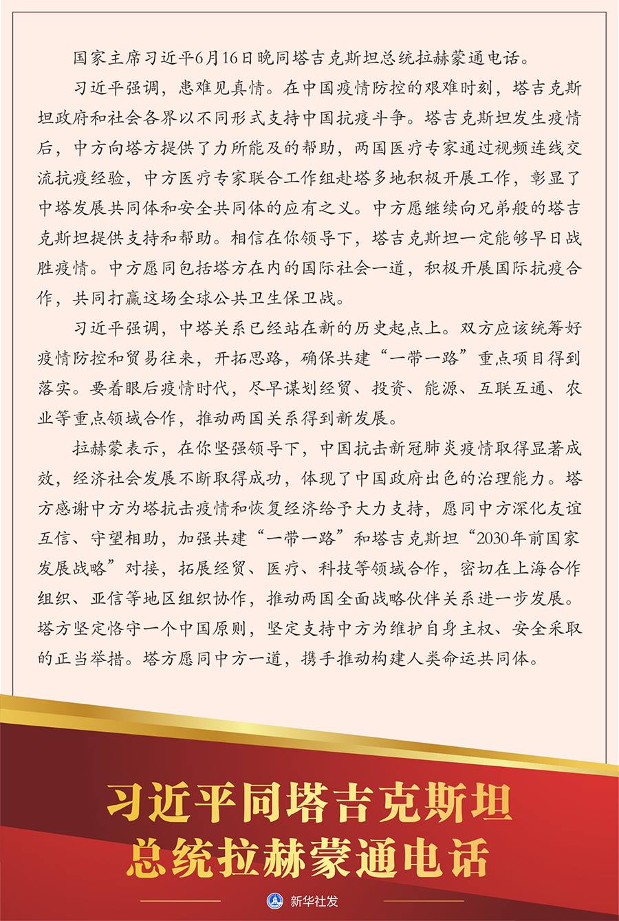 習(xí)近平強(qiáng)調(diào),患難見真情。在中國疫情防控的艱難時刻,塔吉克斯坦政府和社會各界以不同形式支持中國抗疫斗爭。塔吉克斯坦發(fā)生疫情后,中方向塔方提供了力所能及的幫助,兩國醫(yī)療專家通過視頻連線交流抗疫經(jīng)驗(yàn),中方醫(yī)療專家聯(lián)合工作組赴塔多地積極開展工作,彰顯了中塔發(fā)展共同體和安全共同體的應(yīng)有之義。中方愿繼續(xù)向兄弟般的塔吉克斯坦提供支持和幫助。相信在你領(lǐng)導(dǎo)下,塔吉克斯坦一定能夠早日戰(zhàn)勝疫情。中方愿同包括塔方在內(nèi)的國際社會一道,積極開展國際抗疫合作,共同打贏這場全球公共衛(wèi)生保衛(wèi)戰(zhàn)。
