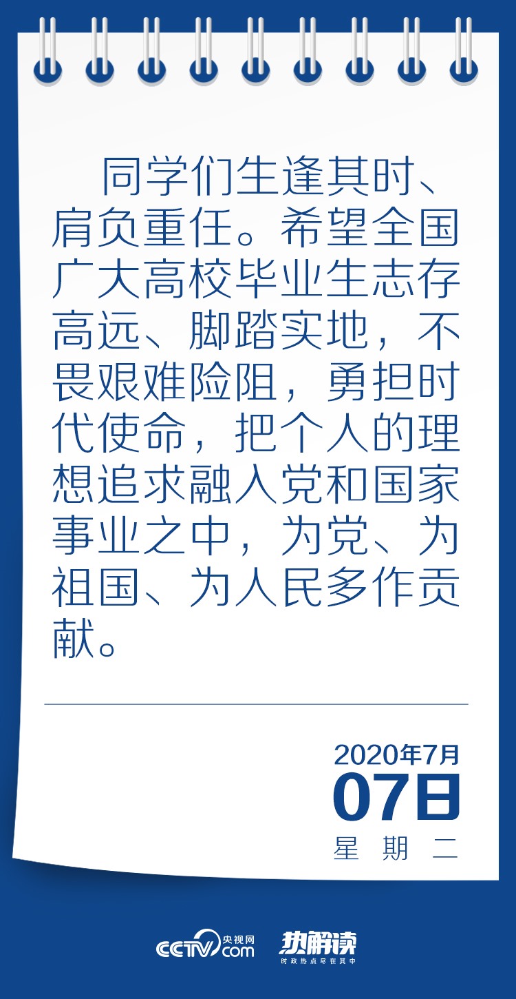 習(xí)近平總書(shū)記在回信中高度肯定了同學(xué)們到邊疆基層工作的選擇,并對(duì)廣大高校畢業(yè)生提出殷切期望:“希望全國(guó)廣大高校畢業(yè)生志存高遠(yuǎn)、腳踏實(shí)地,不畏艱難險(xiǎn)阻,勇?lián)鷷r(shí)代使命,把個(gè)人的理想追求融入黨和國(guó)家事業(yè)之中,為黨、為祖國(guó)、為人民多作貢獻(xiàn)?!?/p>