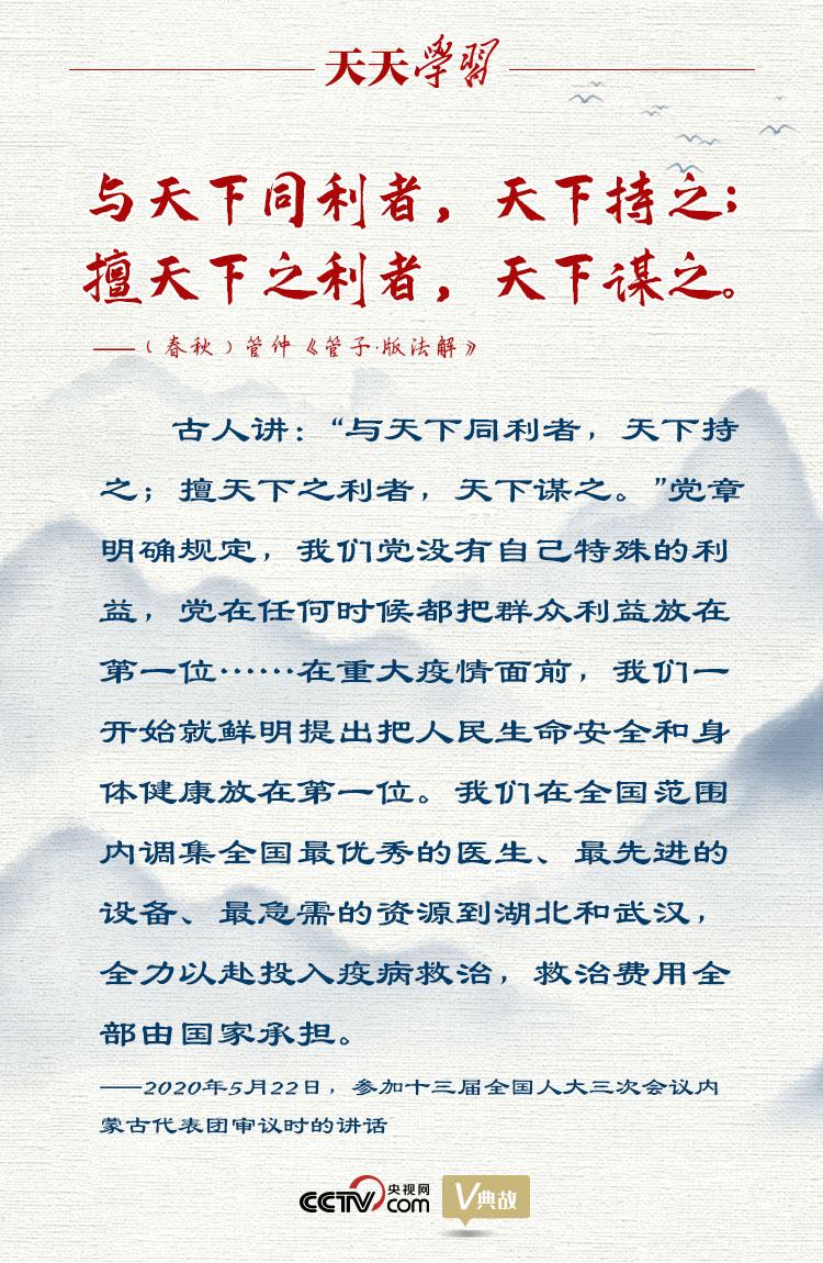 “不惜一切代價!”2020年5月22日,習(xí)近平總書記參加十三屆全國人大三次會議內(nèi)蒙古代表團審議,在談及保護(hù)人民生命安全和身體健康時擲地有聲地說。他在此引用了“與天下同利者,天下持之;擅天下之利者,天下謀之”這句古語,強調(diào)我們黨沒有自己特殊的利益,黨在任何時候都把群眾利益放在第一位。這是我們黨作為馬克思主義政黨區(qū)別于其他政黨的顯著標(biāo)志。