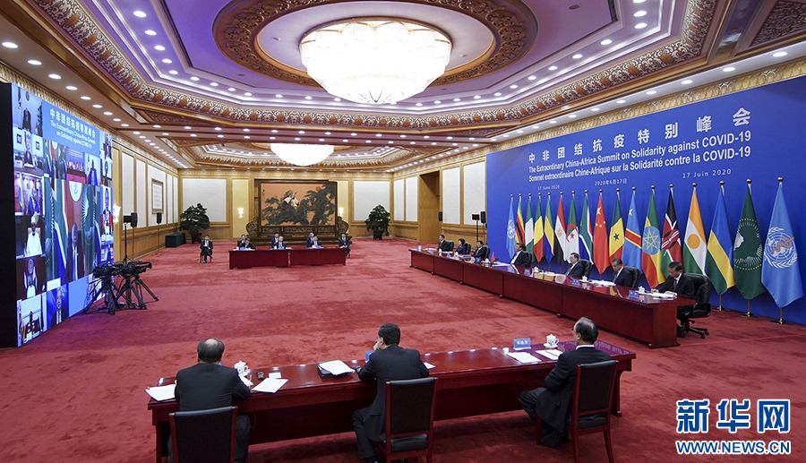 6月17日晚,習(xí)近平在北京主持中非團(tuán)結(jié)抗疫特別峰會并發(fā)表題為《團(tuán)結(jié)抗疫 共克時(shí)艱》的主旨講話。 新華社記者 丁海濤 攝