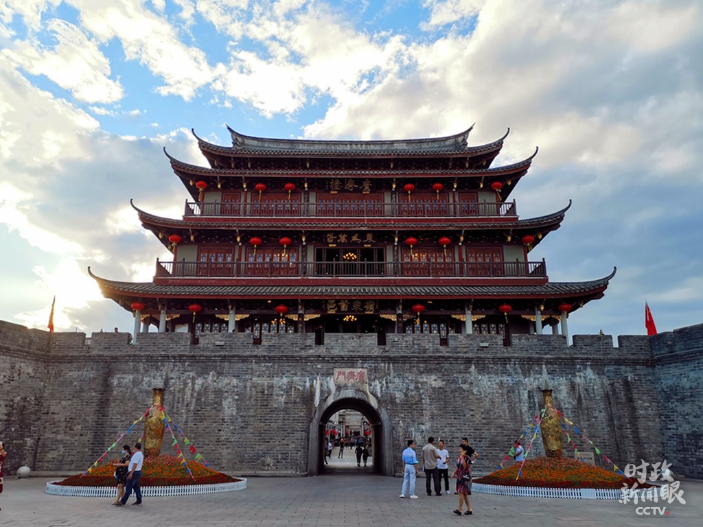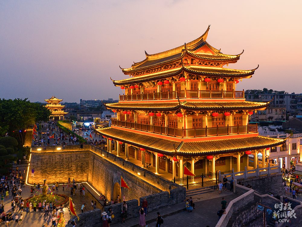 △修復(fù)后的廣濟(jì)門城樓高24.5米,城樓上的“東為萬(wàn)春”和“嶺東首邑”分別由國(guó)際漢學(xué)大師饒宗頤、書法家劉炳森題寫。(總臺(tái)央視記者楊立峰拍攝)