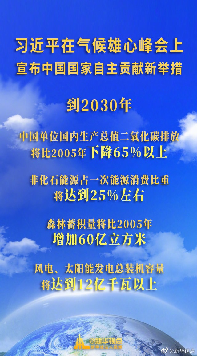 12月12日,國家主席習近平在氣候雄心峰會上宣布中國國家自主貢獻新舉措?! ?/p>