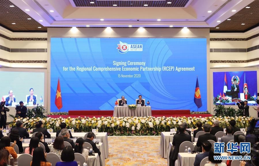 這是2020年11月15日在越南首都河內(nèi)拍攝的區(qū)域全面經(jīng)濟(jì)伙伴關(guān)系協(xié)定(RCEP)簽署儀式現(xiàn)場。新華社/越通社