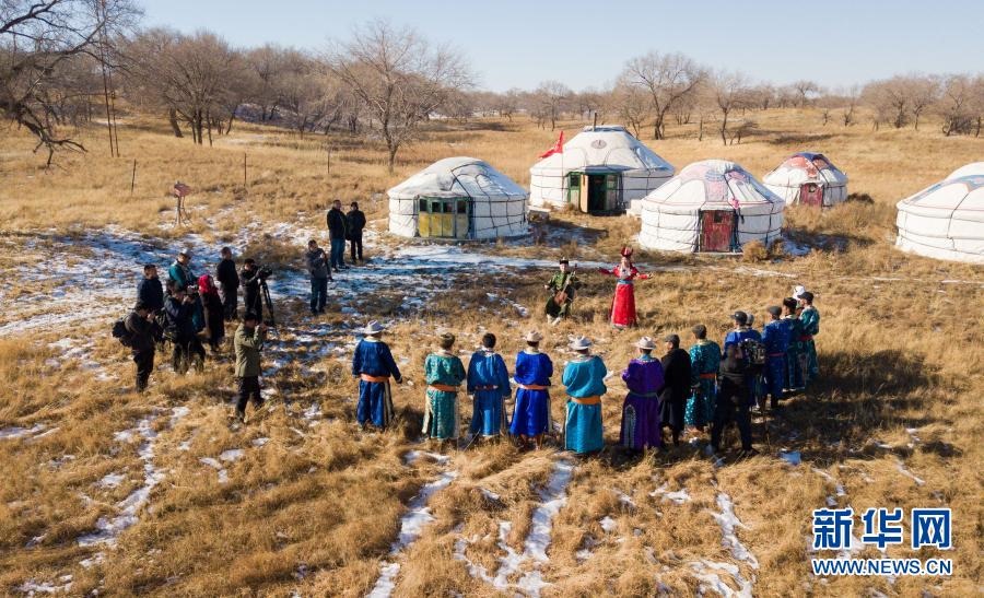 2018年11月9日,內蒙古自治區(qū)錫林郭勒盟烏蘭牧騎隊員來到西烏珠穆沁旗烏蘭哈拉嘎蘇木新高勒嘎查的黨員中心戶恩克巴雅爾家,在戶外為周邊牧民表演節(jié)目(無人機照片)。新華社記者 彭源 攝