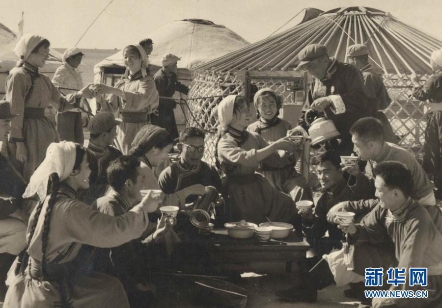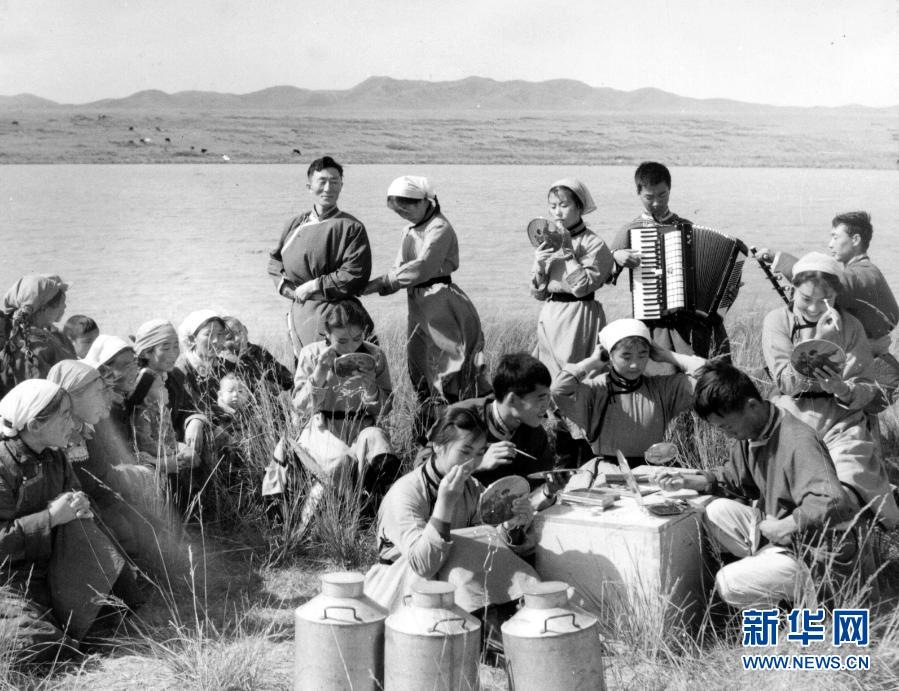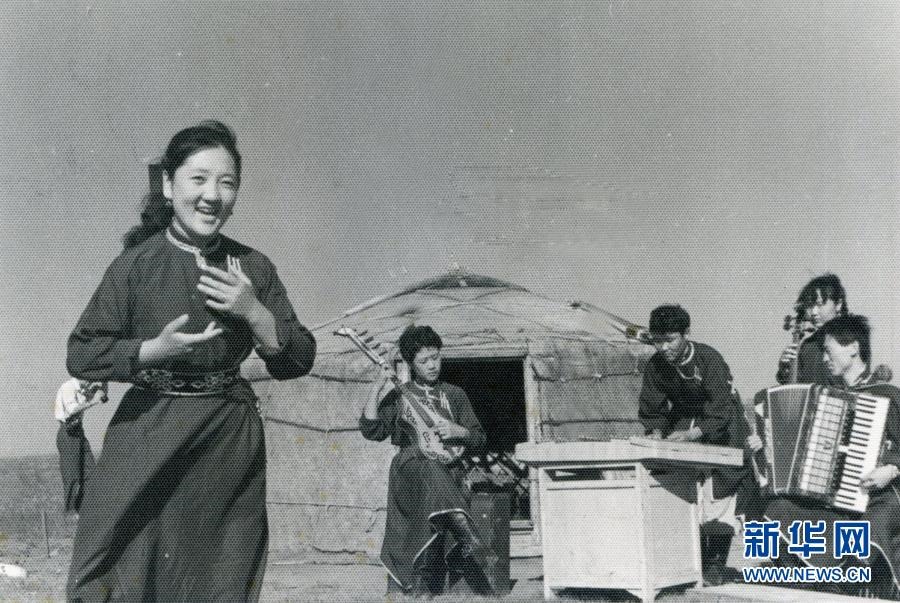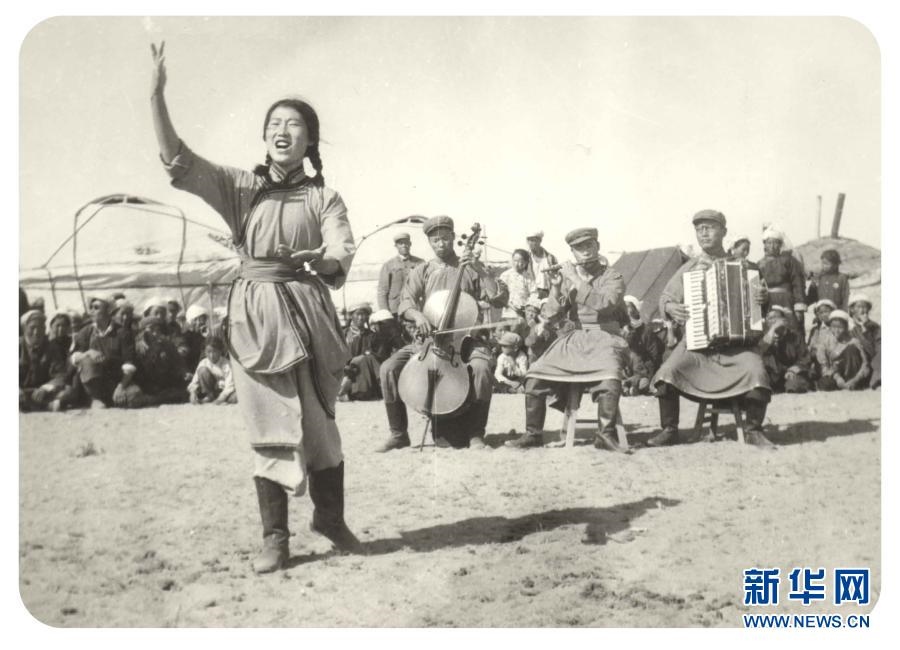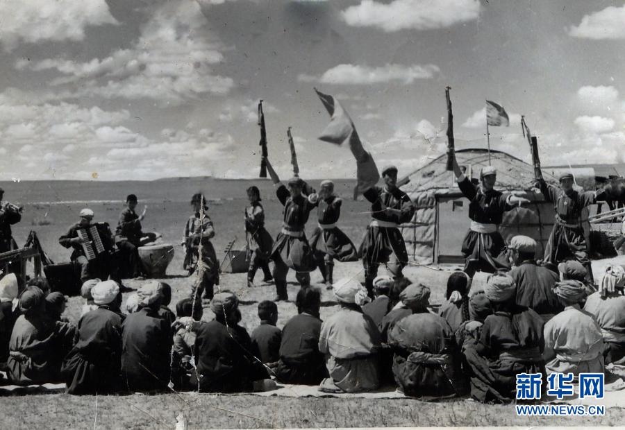 20世紀六七十年代,內蒙古自治區(qū)錫林郭勒盟蘇尼特右旗烏蘭牧騎隊員在草原上為周邊牧民表演節(jié)目(資料照片)。新華社發(fā)