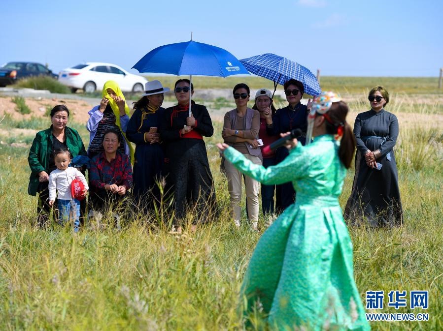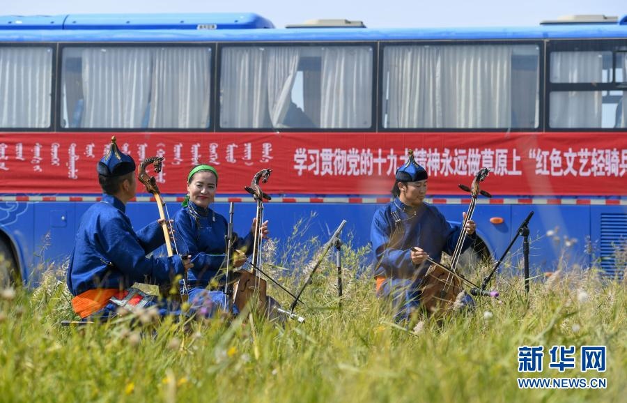 2018年9月13日,在內蒙古自治區(qū)錫林郭勒盟鑲黃旗寶格達音高勒蘇木浩尼欽哈夏圖嘎查的一處草場,鑲黃旗烏蘭牧騎的隊員在為牧民表演文藝節(jié)目。新華社記者