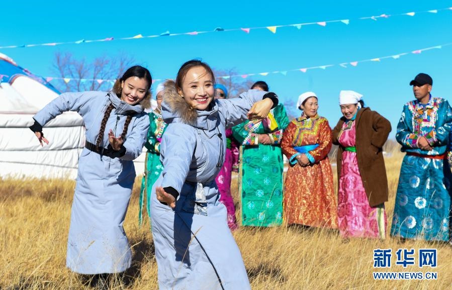 2018年11月9日,內蒙古自治區(qū)錫林郭勒盟烏蘭牧騎隊員來到西烏珠穆沁旗烏蘭哈拉嘎蘇木新高勒嘎查的黨員中心戶恩克巴雅爾家,為周邊牧民表演舞蹈。新華社記者 彭源 攝