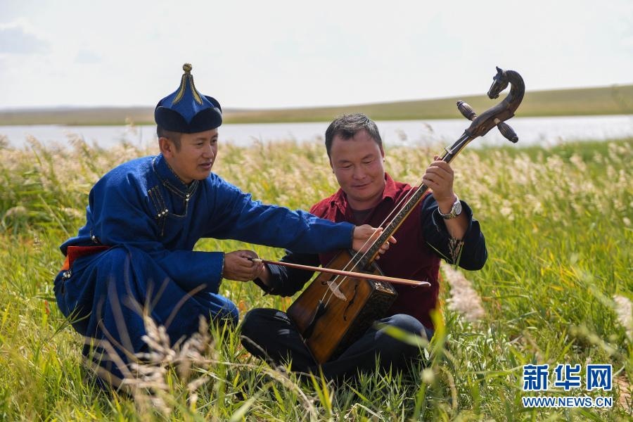 2018年9月13日,在內蒙古自治區(qū)錫林郭勒盟鑲黃旗寶格達音高勒蘇木浩尼欽哈夏圖嘎查的一處草場,鑲黃旗烏蘭牧騎的隊員在為牧民演奏馬頭琴。新華社記者