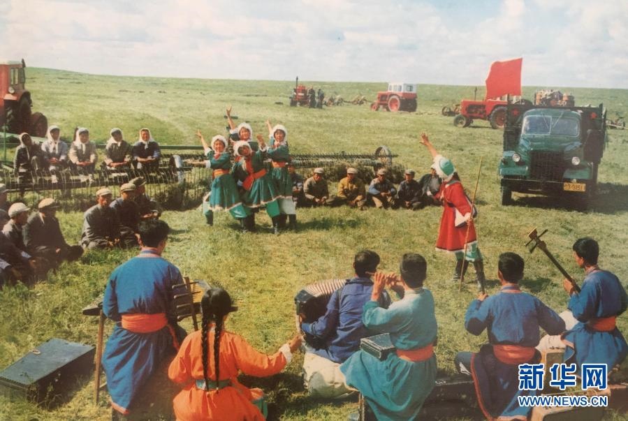 20世紀七十年代,錫林郭勒盟烏蘭牧騎隊員在草原上為牧民演出(資料照片)。新華社發(fā)