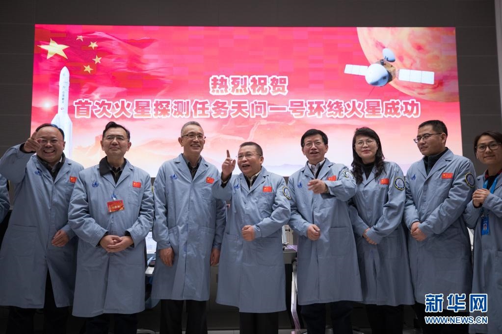 2021年2月10日,在北京航天飛行控制中心指揮大廳,航天科研人員慶祝我國(guó)首次火星探測(cè)任務(wù)天問(wèn)一號(hào)環(huán)繞火星成功。新華社記者 金立旺 攝