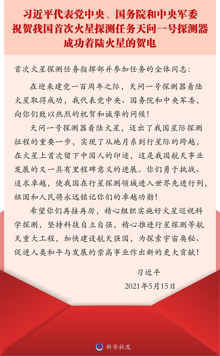 在迎來(lái)建黨一百周年之際,天問(wèn)一號(hào)探測(cè)器著陸火星取得成功,我代表黨中央、國(guó)務(wù)院和中央軍委,向你們致以熱烈的祝賀和誠(chéng)摯的問(wèn)候!