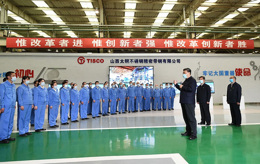 △2020年5月12日,習(xí)近平在山西太鋼不銹鋼精密帶鋼有限公司同企業(yè)職工親切交流。