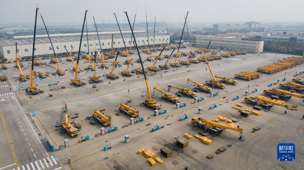 這是2019年4月4日在徐工集團徐州重型機械有限公司拍攝的調(diào)試中的起重機(無人機照片)。新華社記者 李響 攝