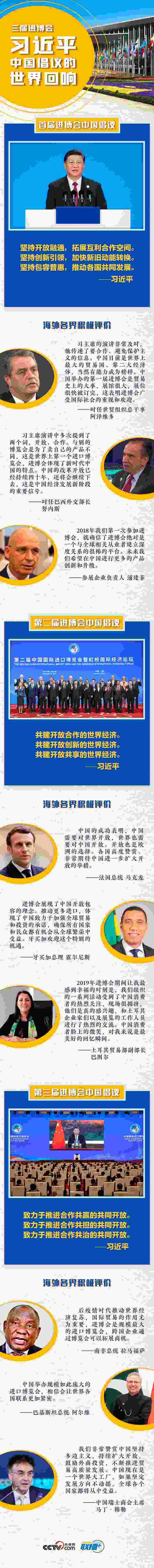在歷屆進(jìn)博會(huì)上,習(xí)近平主席都提出了推動(dòng)建設(shè)開放型世界經(jīng)濟(jì)的中國(guó)倡議,宣布了中國(guó)擴(kuò)大對(duì)外開放的一系列務(wù)實(shí)舉措,贏得國(guó)際社會(huì)的廣泛認(rèn)同。