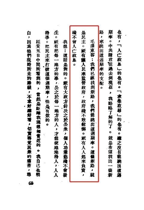 在黃炎培看來,“這話是對的”,因?yàn)椤爸挥邪衙恳坏胤降氖?,公之于每一地方的人,才能使地地得人,人人得事。用民主來打破這周期率,怕是有效的”。