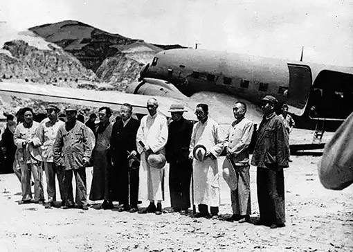 1945年7月,國民參政會參政員黃炎培等六人飛抵延安,同中國共產(chǎn)黨商談兩黨團(tuán)結(jié)、共建國內(nèi)和平問題,毛澤東等親臨機(jī)場歡迎。圖:新華社