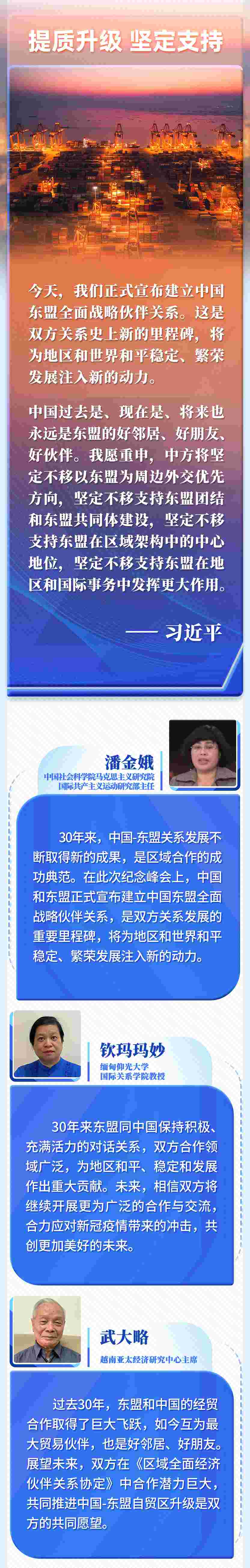 30年的寶貴經驗是中國和東盟的共同財富,為雙方發(fā)展全面戰(zhàn)略伙伴關系奠定了基礎、提供了遵循。我們要倍加珍惜、長久堅持,并在新的實踐中不斷豐富和發(fā)展。