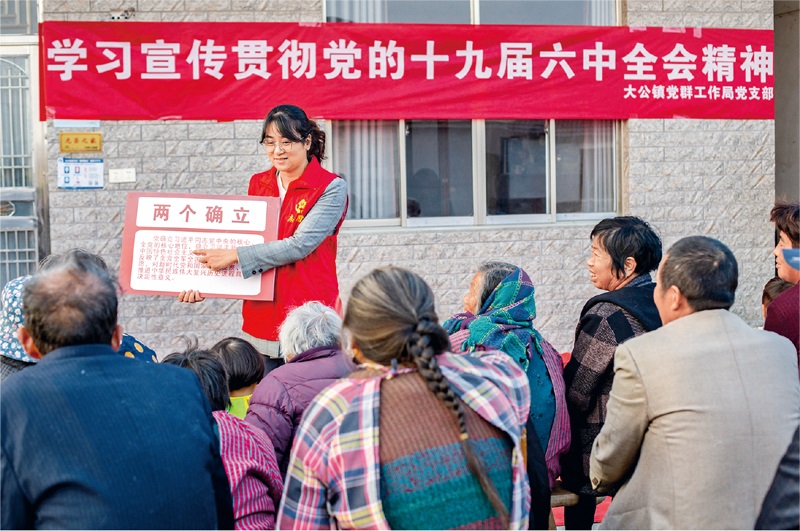 2021年11月18日,江蘇省南通市海安市大公鎮(zhèn)黨員志愿者在常河村12組向村民宣傳黨的十九屆六中全會(huì)精神,用老百姓聽(tīng)得懂、能領(lǐng)會(huì)的方式將全會(huì)精神傳達(dá)到基層。人民視覺(jué)翟慧勇/攝