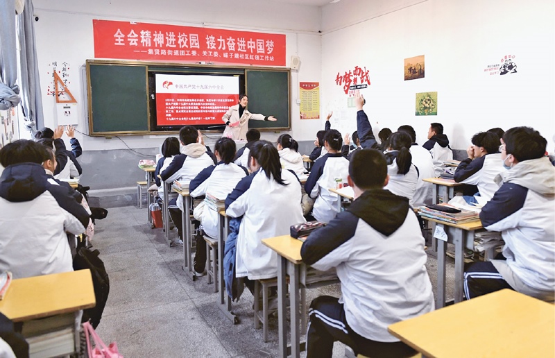 2021年11月24日,安徽省安慶市大觀區(qū)集賢路街道團(tuán)工委、碟子塘社區(qū)紅領(lǐng)工作站聯(lián)合開(kāi)展黨的十九屆六中全會(huì)精神宣講進(jìn)校園活動(dòng)。中新社發(fā)項(xiàng)順平/攝