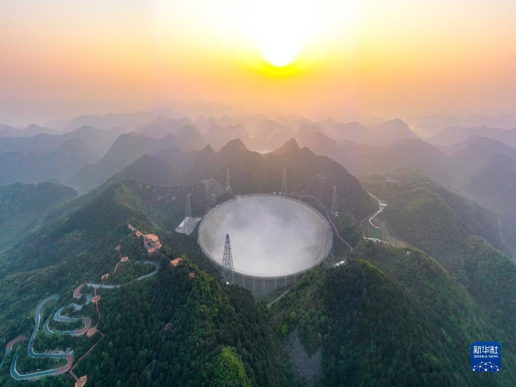 3月31日清晨拍攝的“中國(guó)天眼”全景(維護(hù)保養(yǎng)期間拍攝,無人機(jī)照片)。新華社記者歐東衢攝