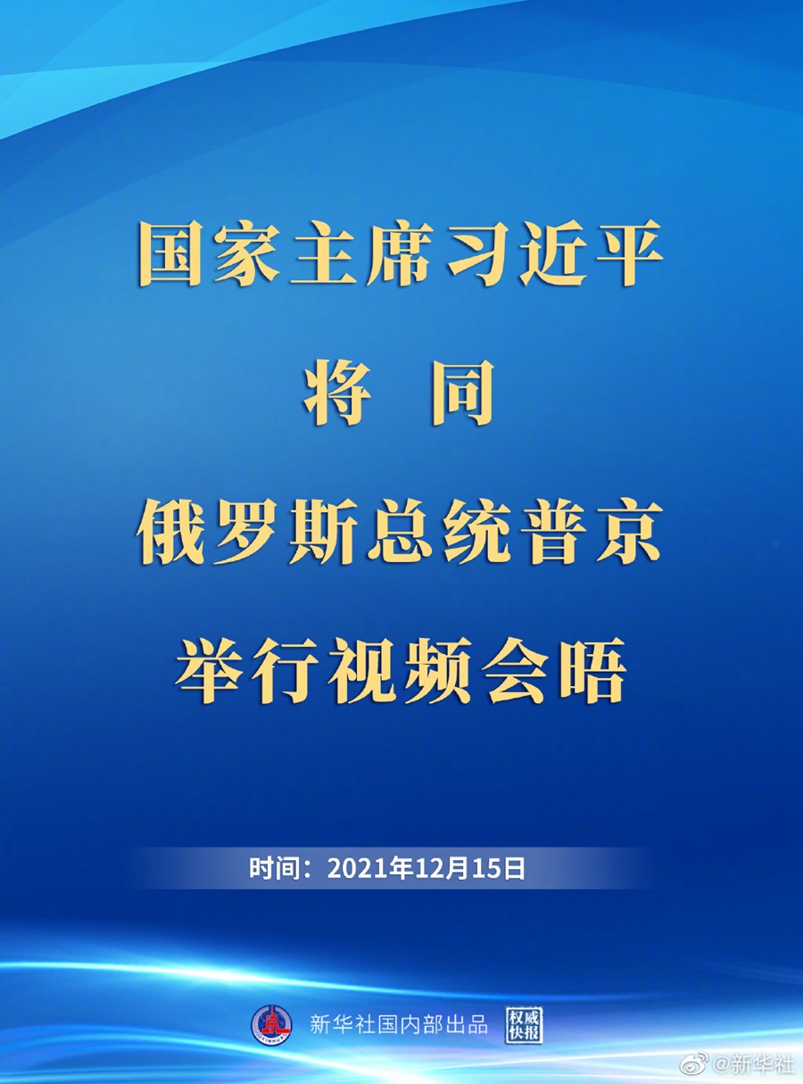 外交部發(fā)言人華春瑩12月13日宣布:國(guó)家主席習(xí)近平將于12月15日在北京同俄羅斯聯(lián)邦總統(tǒng)普京舉行視頻會(huì)晤。
