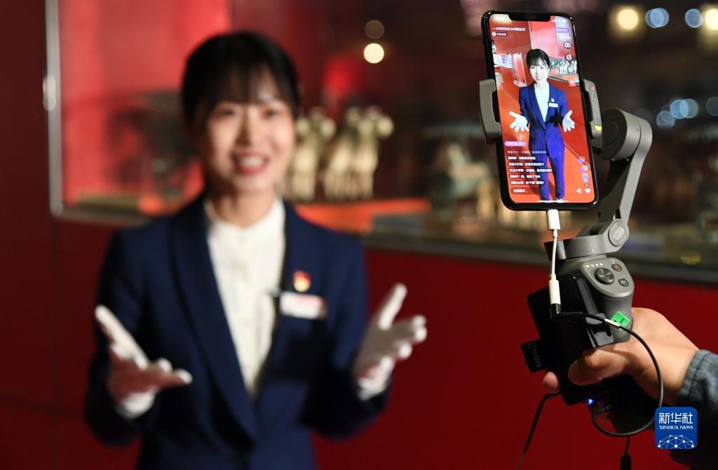 2020年4月30日,在北京汽車博物館,講解員曾紅娟通過(guò)網(wǎng)絡(luò)直播平臺(tái)為觀眾介紹館內(nèi)的藏品車。新華社記者 任超/攝