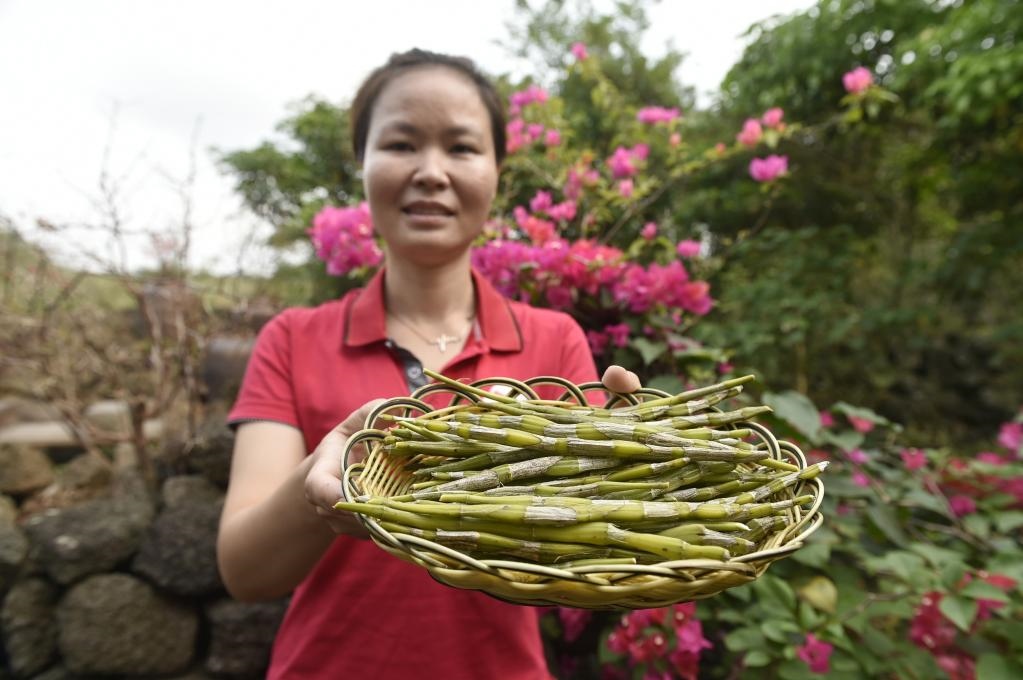 2019年3月14日,村民在海南??谑行阌^(qū)石山鎮(zhèn)施茶村石斛園展示新鮮的石斛。新華社記者魯鵬攝