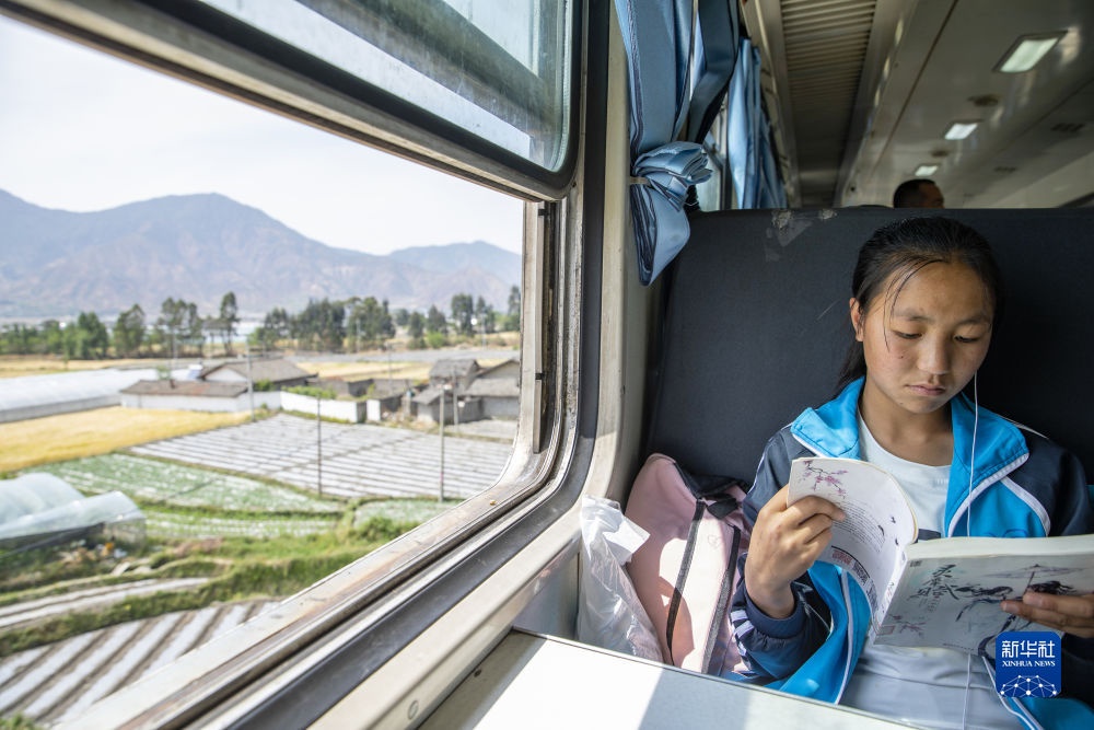 2021年4月15日,一名喜德縣瓦爾學校的學生乘坐5634次列車回家。5633/5634次列車被人們親切地稱為“慢火車”,陪伴著四川大涼山地區(qū)幾代人的成長,是百姓外出的“公交列車”,也是孩子們求學的“校車”。新華社記者 沈伯韓攝