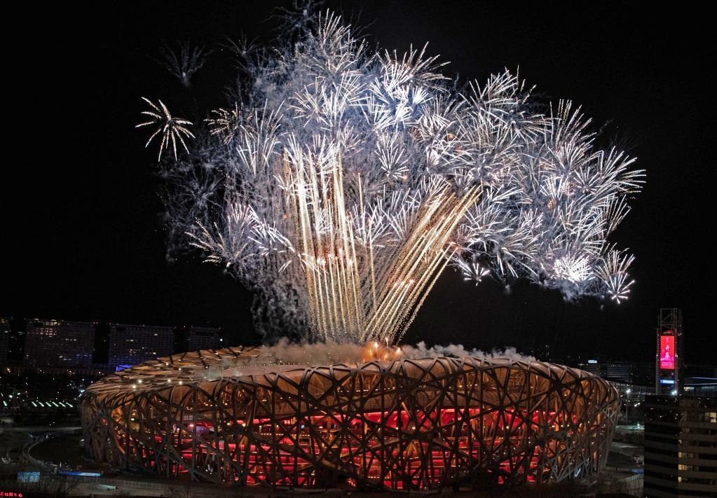 2月4日晚,第二十四屆冬季奧林匹克運(yùn)動(dòng)會(huì)開幕式在北京國家體育場舉行。圖為焰火表演。新華社記者鄔惠我攝