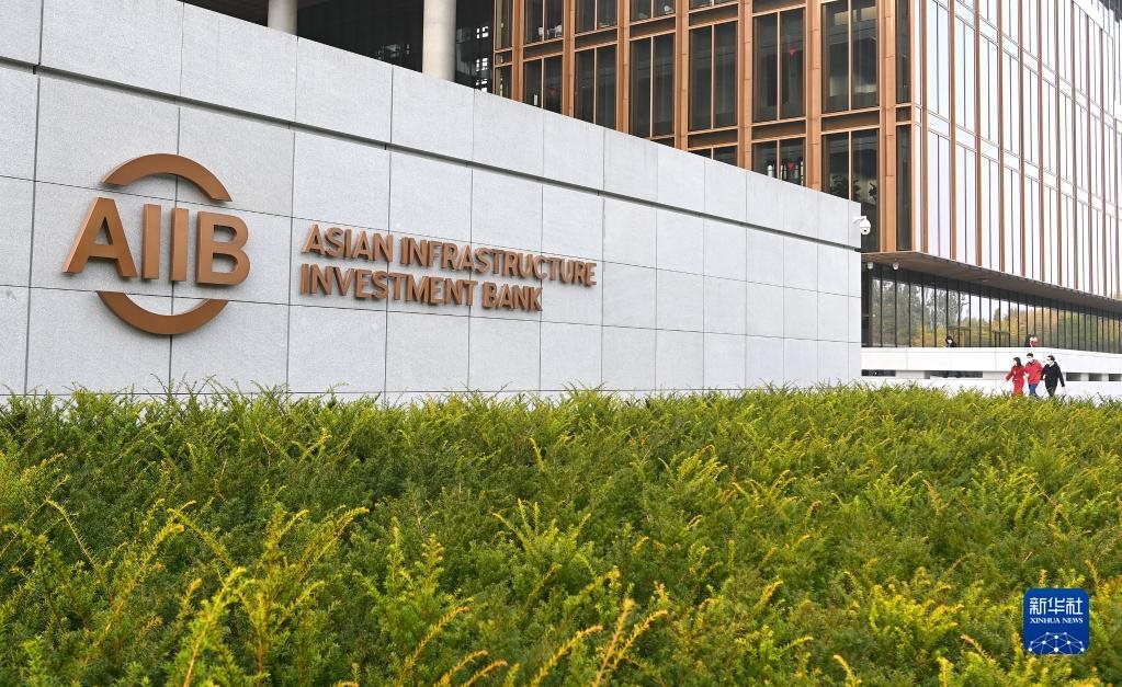 這是2021年10月25日拍攝的亞洲基礎(chǔ)設(shè)施投資銀行(亞投行)標(biāo)志。新華社記者 李賀 攝