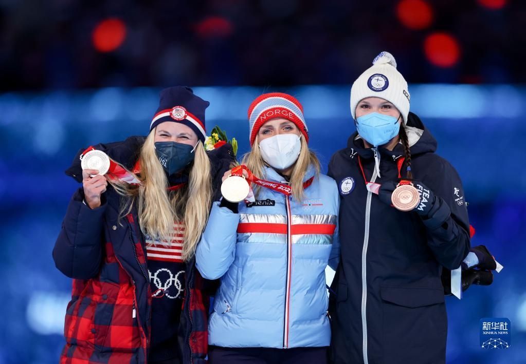 這是越野滑雪女子30公里集體出發(fā)(自由技術)冠軍挪威選手特蕾絲·約海于格(中)、亞軍美國選手杰茜·迪金斯(左)和季軍芬蘭選手凱爾圖·尼斯卡寧在獎牌頒發(fā)儀式上。
