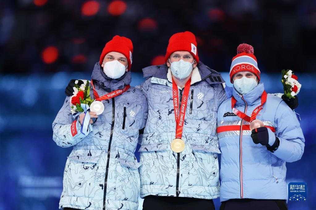 這是越野滑雪男子50公里集體出發(fā)(自由技術)冠軍俄羅斯奧委會選手亞歷山大·博利舒諾夫(中)、亞軍俄羅斯奧委會選手伊萬·亞基穆什金(左)和季軍挪威選手西蒙·赫格斯塔德·克呂格爾在獎牌頒發(fā)儀式上。