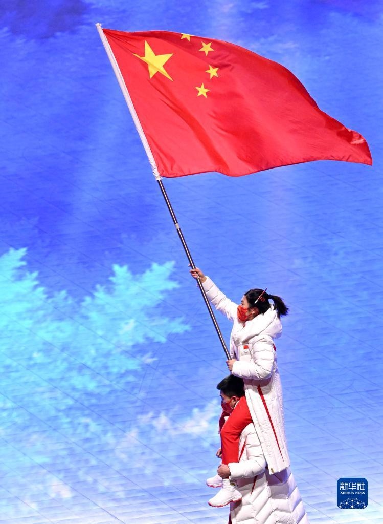 這是中國代表團旗手徐夢桃與高亭宇在閉幕式上入場。