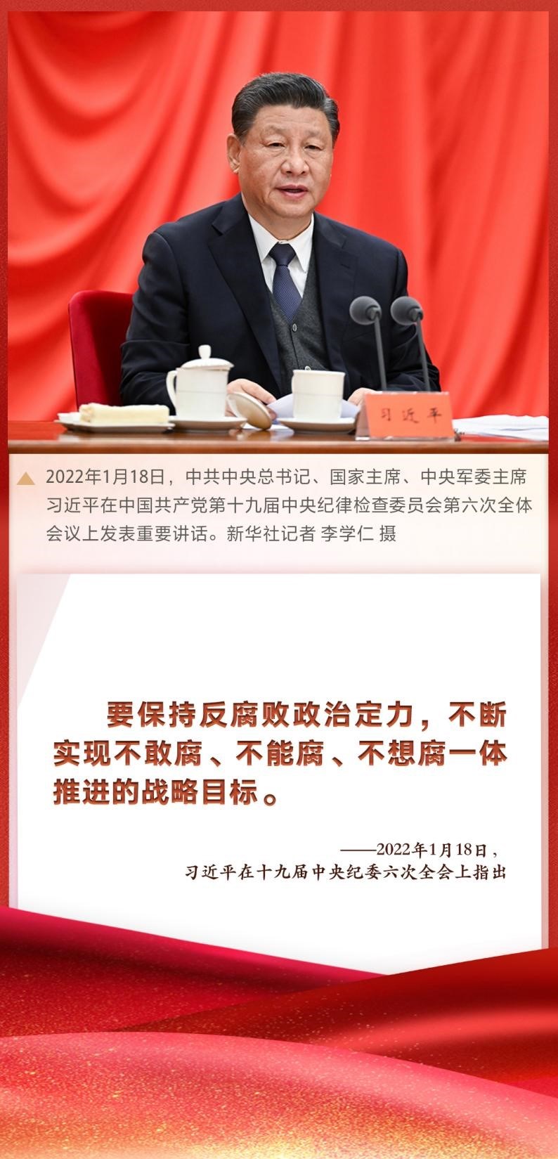 “要保持反腐敗政治定力,不斷實現(xiàn)不敢腐、不能腐、不想腐一體推進的戰(zhàn)略目標?!敝泄仓醒肟倳洝抑飨?、中央軍委主席習近平在十九屆中央紀委六次全會上發(fā)表重要講話,深刻總結新時代黨的自我革命的成功實踐,深刻闡述全面從嚴治黨取得的歷史性、開創(chuàng)性成就,產(chǎn)生的全方位、深層次影響,對堅持不懈把全面從嚴治黨向縱深推進、迎接黨的二十大勝利召開作出戰(zhàn)略部署。