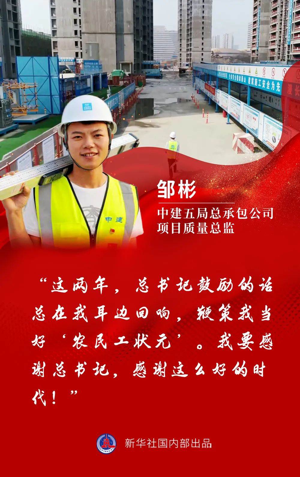 “這兩年,總書(shū)記鼓勵(lì)的話總在我耳邊回響,鞭策我當(dāng)好‘農(nóng)民工狀元’。我要感謝總書(shū)記,感謝這么好的時(shí)代!”鄒彬臉上洋溢著青春的光芒。