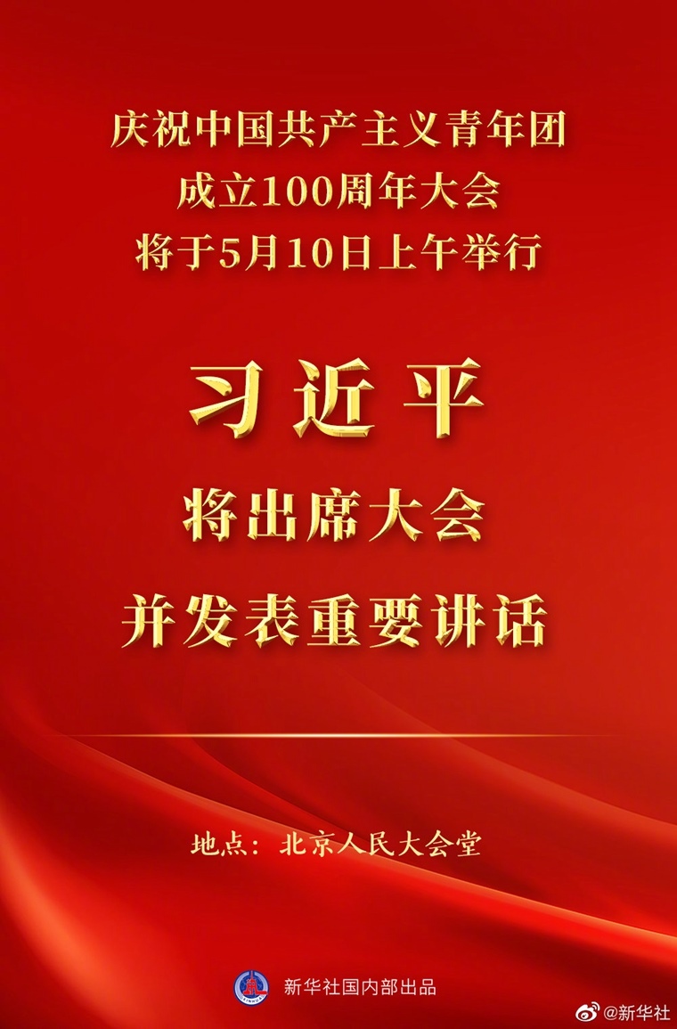 新華社北京5月8日電慶祝中國共產(chǎn)主義青年團(tuán)成立100周年大會(huì)將于5月10日上午在北京人民大會(huì)堂隆重舉行。中共中央總書記、國家主席、中央軍委主席習(xí)近平將出席大會(huì)并發(fā)表重要講話。