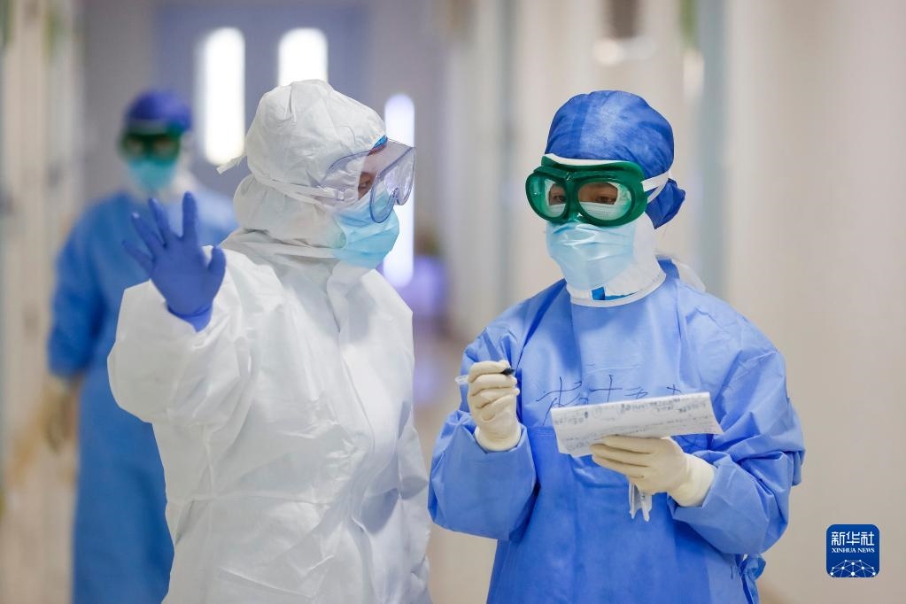 在武漢市金銀潭醫(yī)院的一個(gè)病區(qū),金銀潭醫(yī)院護(hù)士與浙江省人民醫(yī)院護(hù)士(右)交接工作(2020年3月18日攝)。新華社記者 沈伯韓 攝