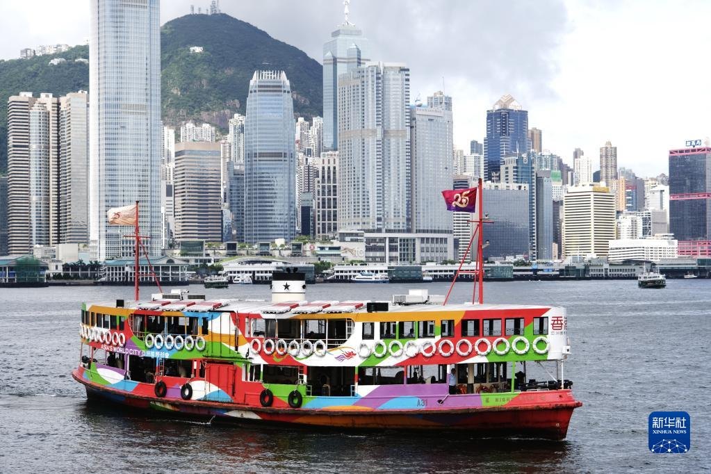 在香港尖沙咀天星碼頭,天星小輪載著慶祝香港回歸祖國25周年標志的旗幟在維港航行(2022年6月22日攝)。新華社記者 王申 攝