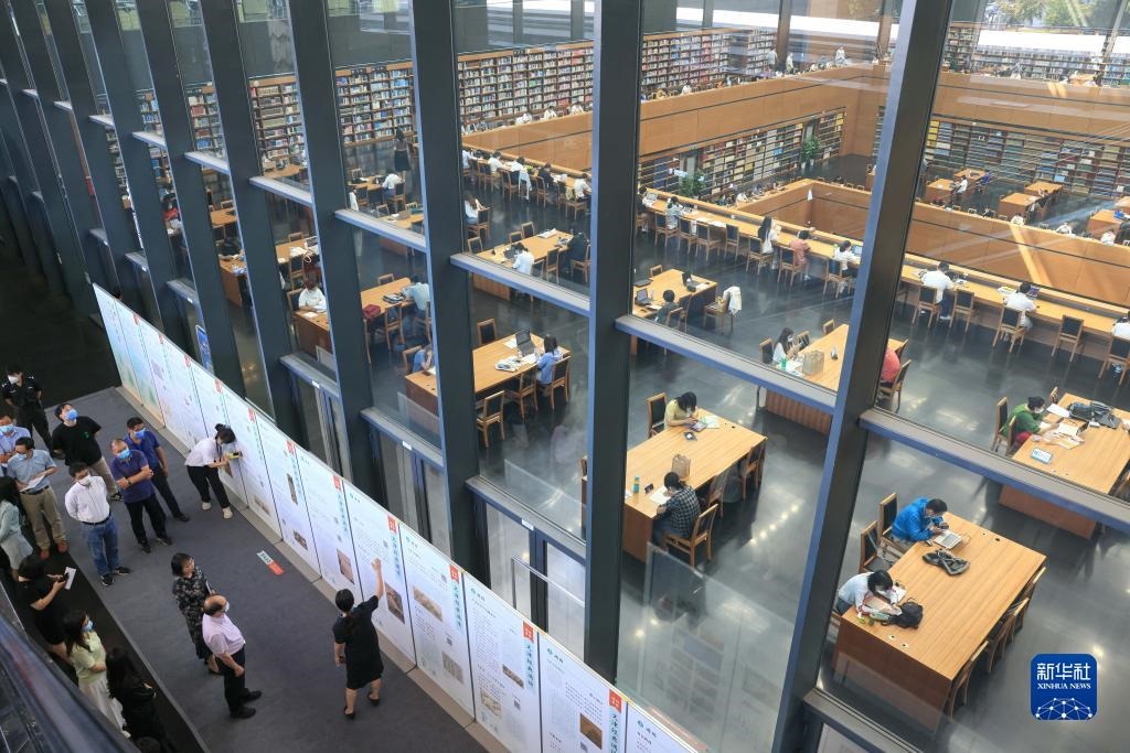 在北京國家圖書館,工作人員在介紹“經(jīng)典,予生活以詩意——‘文津經(jīng)典誦讀’十周年主題展”(2022年9月7日攝)。新華社記者殷剛攝