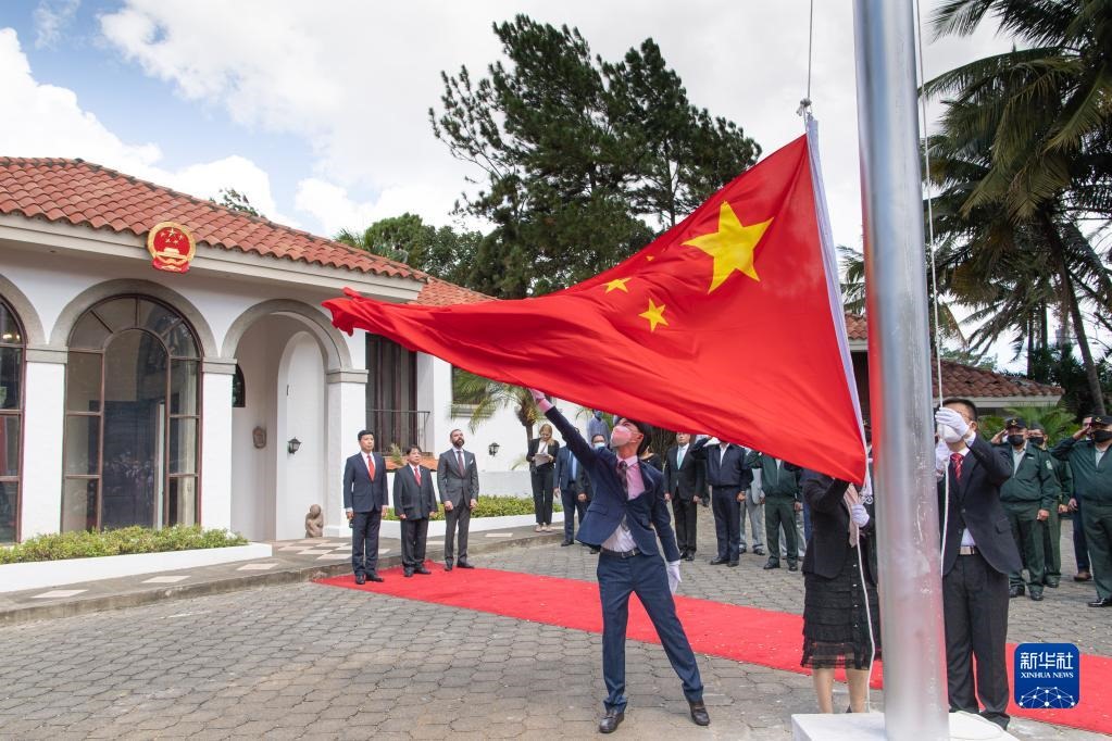 在尼加拉瓜首都馬那瓜舉行的中國駐尼加拉瓜大使館復(fù)館儀式上,五星紅旗伴隨著《義勇軍進(jìn)行曲》冉冉升起(2021年12月31日攝)。新華社記者 辛悅衛(wèi) 攝