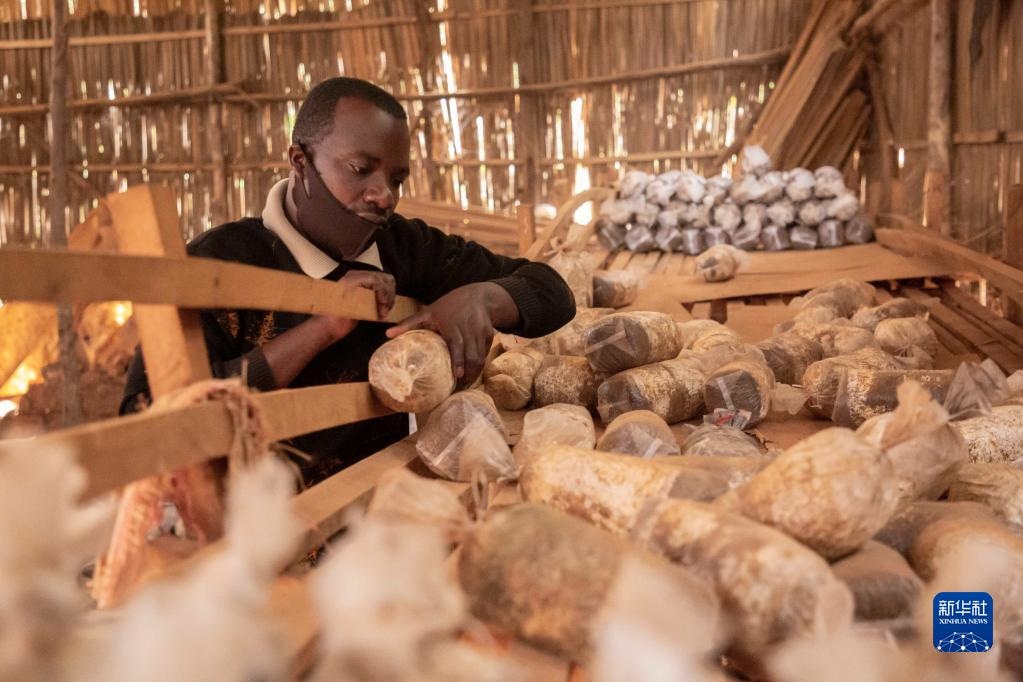 在盧旺達(dá)首都基加利的一家食用菌培育作坊,作坊主人埃馬紐埃爾·阿希馬納檢查菌袋(2020年9月9日攝)。中國福建農(nóng)林大學(xué)的菌草專家2006年來到盧旺達(dá)開始菌草技術(shù)合作項目,在當(dāng)?shù)厥痉逗屯茝V菌草技術(shù)。新華社發(fā)(西里爾·恩德格亞攝)